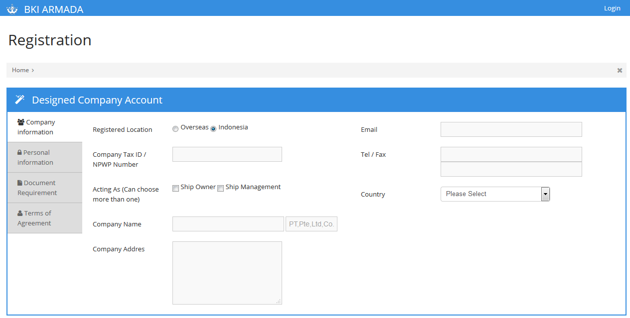 Data Perusahaan agar dilengkapi, termasuk pilihan user ( Acting as ) Ship owner atau Ship management.