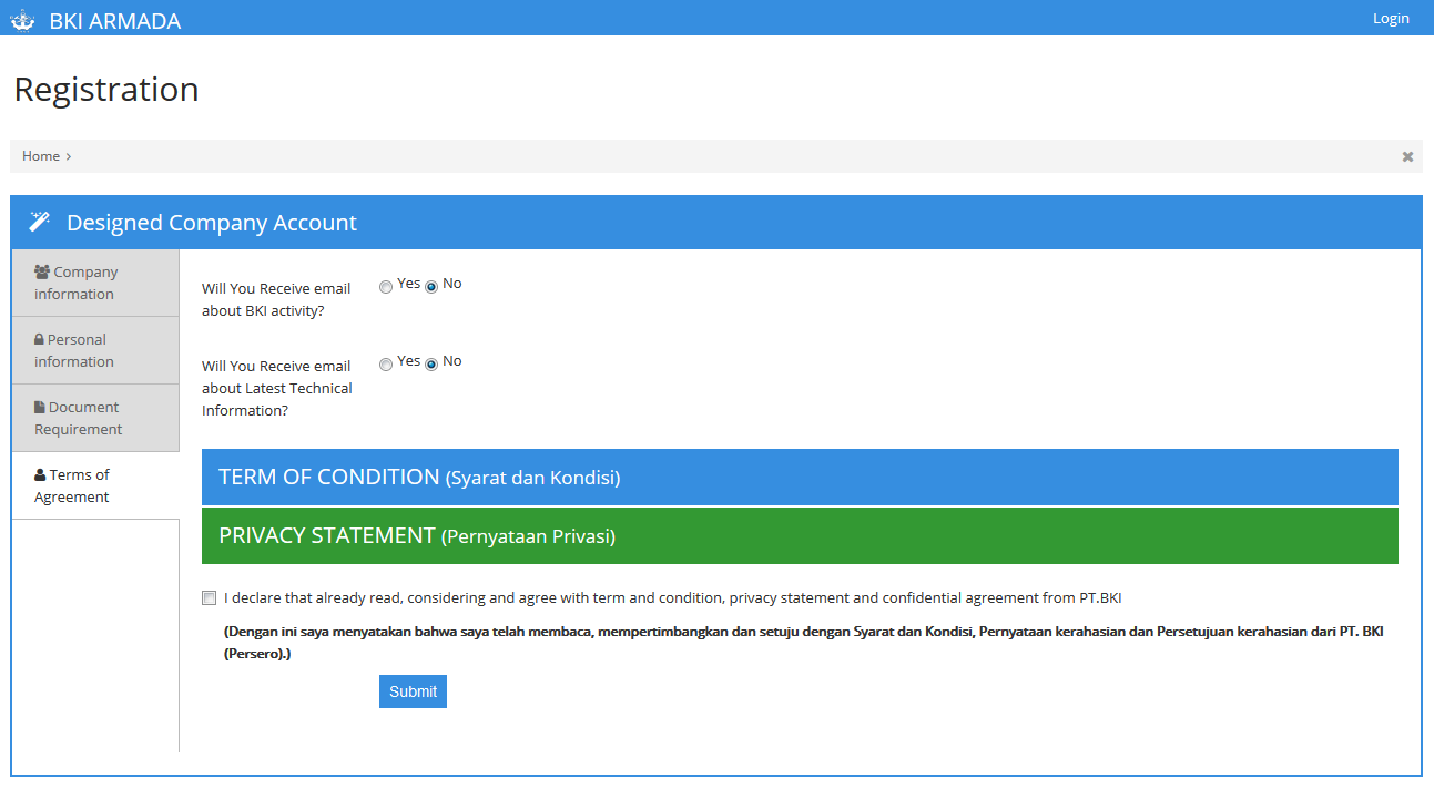 Aplikasi yang telah diisi lengkap di submit ke Server BKI. BKI akan memberikan jawaban via e-mail atas pengajuan aplikasi yang